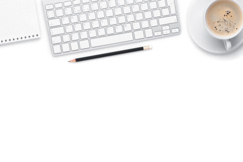 Office desk table with computer, supplies and coffee cup