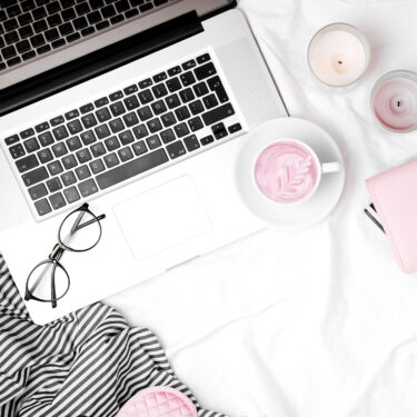 Workspace in bed with laptop and coffee. Morning concept. Flat lay